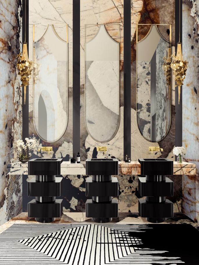 The Dara Rug by Rug’Society brings warmth, elegance, and refined texture to this luxurious bathroom design. Its geometric pattern and soft neutral tones complement the marble surfaces, golden accents, and sculptural fixtures, creating a serene and visually balanced atmosphere. Meticulously handcrafted, this modern rug enhances the comfort and sophistication of the space, making it an ideal choice for high-end bathrooms, spa-like suites, or bespoke residential projects. The Dara Rug’s subtle design integrates seamlessly into the decor, adding depth and contemporary character without overwhelming the environment.