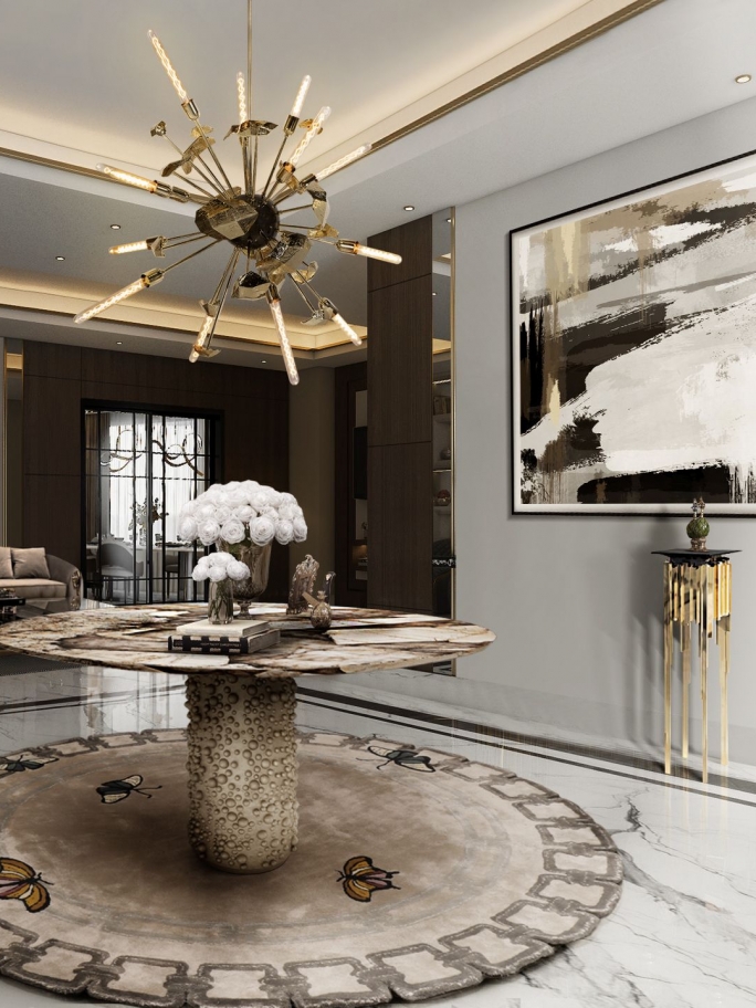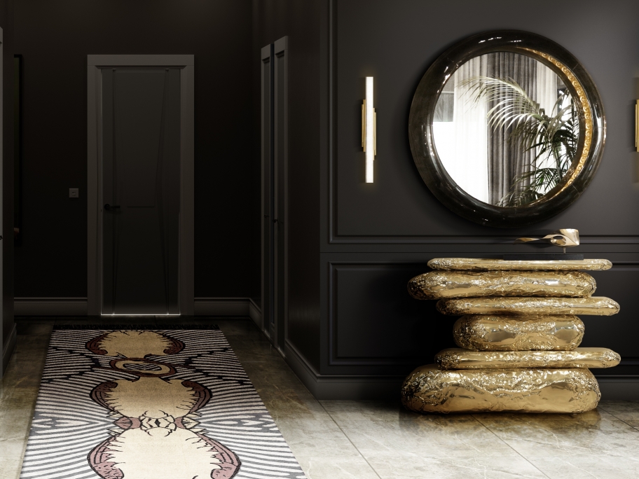In this elegant hallway setting, the Dara II Rug by Rug’Society introduces a sense of calm sophistication through its subtle pattern and soft neutral palette. Stretching gracefully along the wooden floor, the rug enhances the architectural rhythm of the space while complementing the sculptural bench and the ornate gold-framed mirror. Its refined texture and understated design create a seamless transition between classic details and contemporary elegance. Handcrafted with precision, the Dara II Rug anchors the corridor with warmth and balance, transforming a transitional area into a serene and visually harmonious interior.