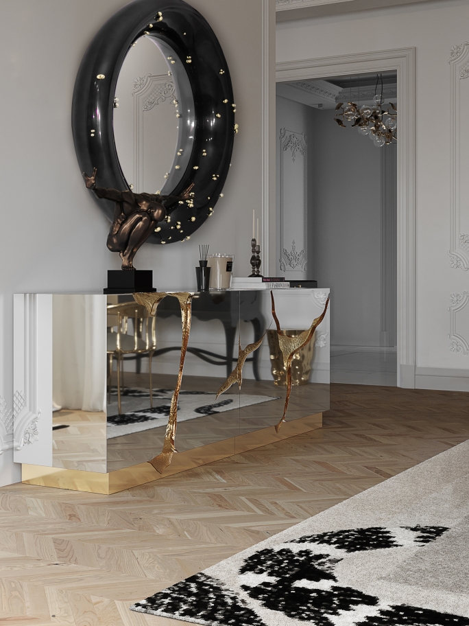 The Warao Rug radiates elegance in this contemporary hallway. This rug is hand-tufted in botanical silk and ties together all your interior design projects.
