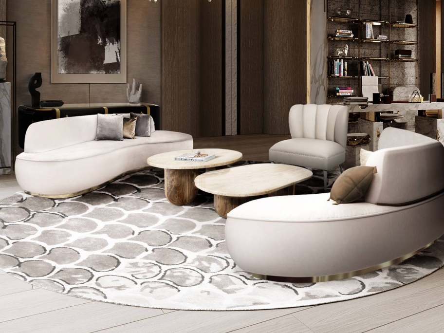 This classic living room, adorned with sculptural furniture pieces from Boca do Lobo, exudes a sense of luxury and artistic flair. At the heart of this living area lies the Ruin Rug. Its neutral palette and minimalist design are inspired by the beauty of ancient ruins, bringing a touch of historical reverence into the space.
