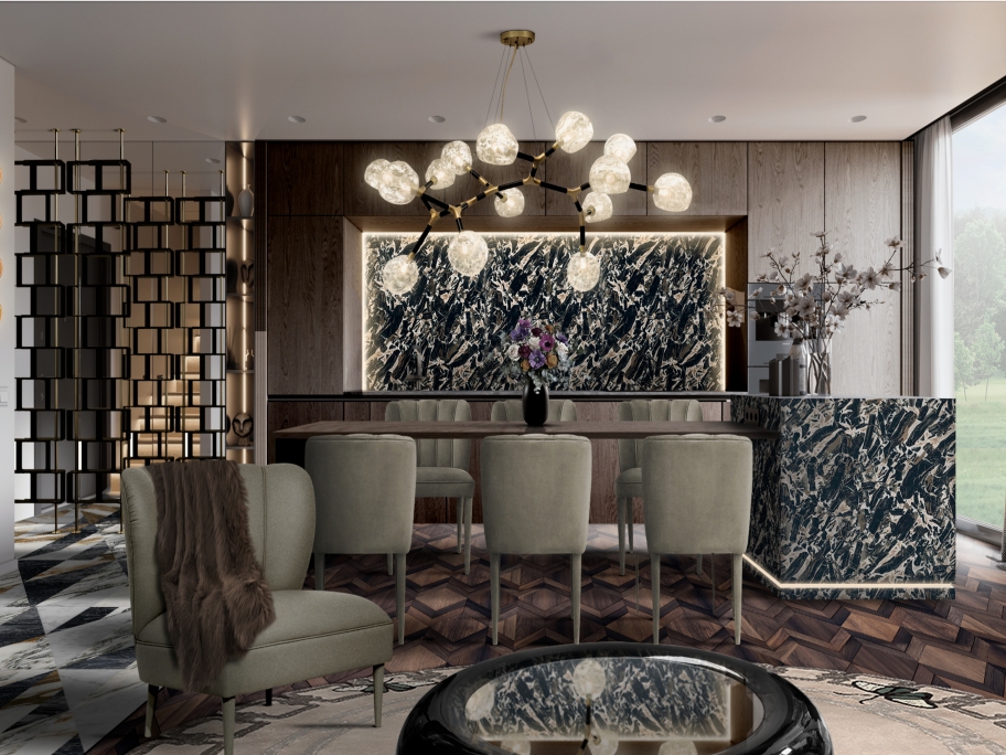 A classy modern contemporary dining room with the Metamorphosis Rug. This round rug gives some texture and brings warmth to this eating space. This neutral rug inspired by nature is great for dining rooms with circular elements such as a dining table, mirror, suspension lamps, and so on.