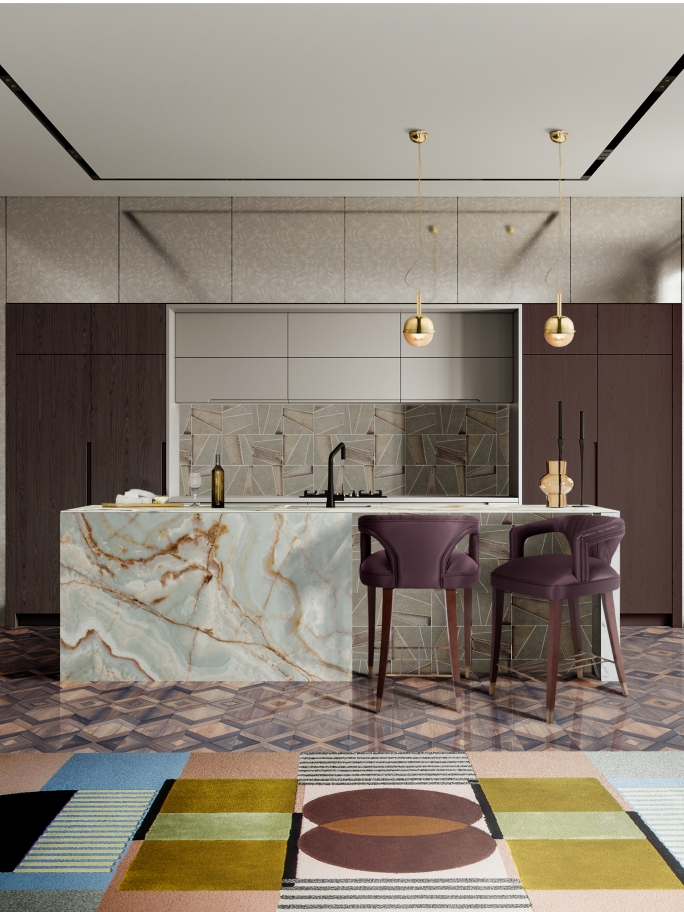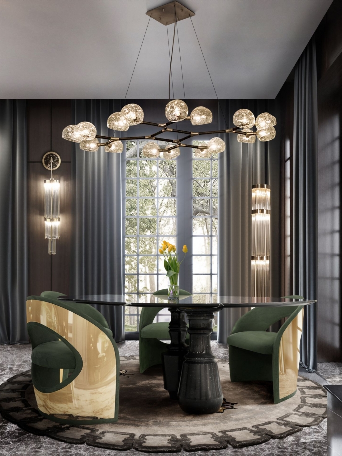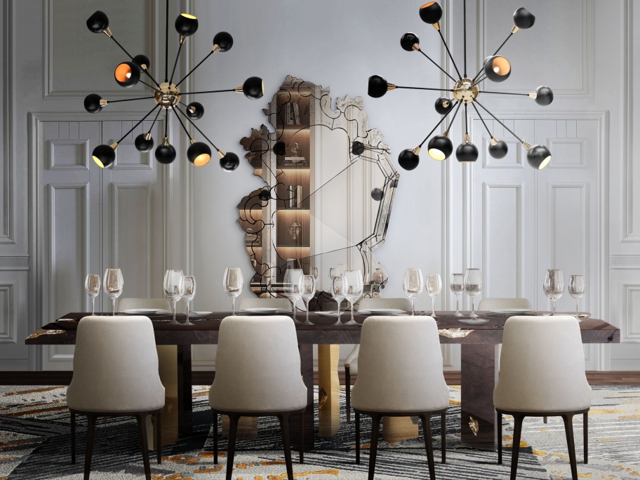 Golden hues with a black and white rug are all the rage. As you can expect, the Imperial Snake Rug is a sight to behold under these conditions. Its color neutrality with the symbolism of the snake is a most powerful statement for your dining room interior designs. As such, the fantastic rendition of the golden chairs with the black and golden dining table is one of the most alluring interiors yet.