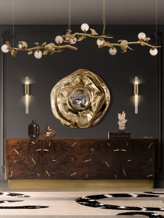 A modern classic hallway with a botanical reference by the Feline Rug, that brings a geometric twist and the fauna and flora reference. This botanical rug creates a strong, imposing, and dominant feeling in this room. Rich in different textures and different materials, the Feline rug is a metaphoric force that the animal may have in controversy with human action.