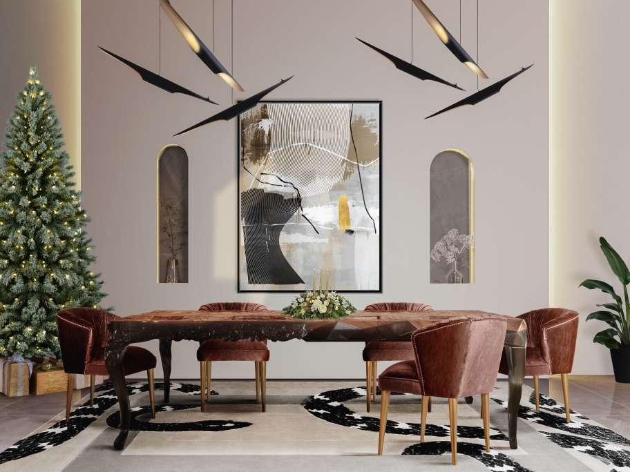 This glaring dining room exhales the glamour of the neutral tones. The white Garden rug helps tie the color scheme of the room, transmitting comfort and a warm feeling. Handmade with botanical silk this high-end rug is suitable for any environment.
