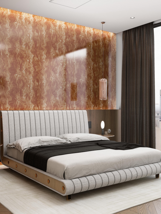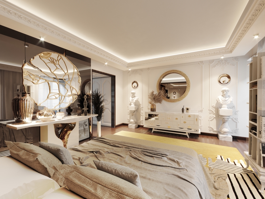 A rug should always frame the bed and side table to create a harmonious design. The Neptuno rug has a stunning design inspired by sea algae and the Greek God Neptuno. This lovely bedroom is cozy thanks to its neutral color palette and soft wooled rug.