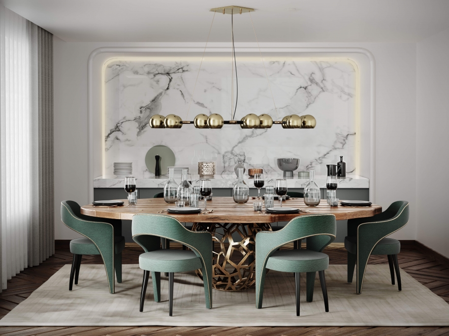 A luxurious and opulent dining room with the rectangular Oslo Rug. The white and brown hues of the rug match the oak cabinet and light beige dining chairs. The golden features add an elegant flair and turn this interior into the most lavishing dining room you have ever seen.