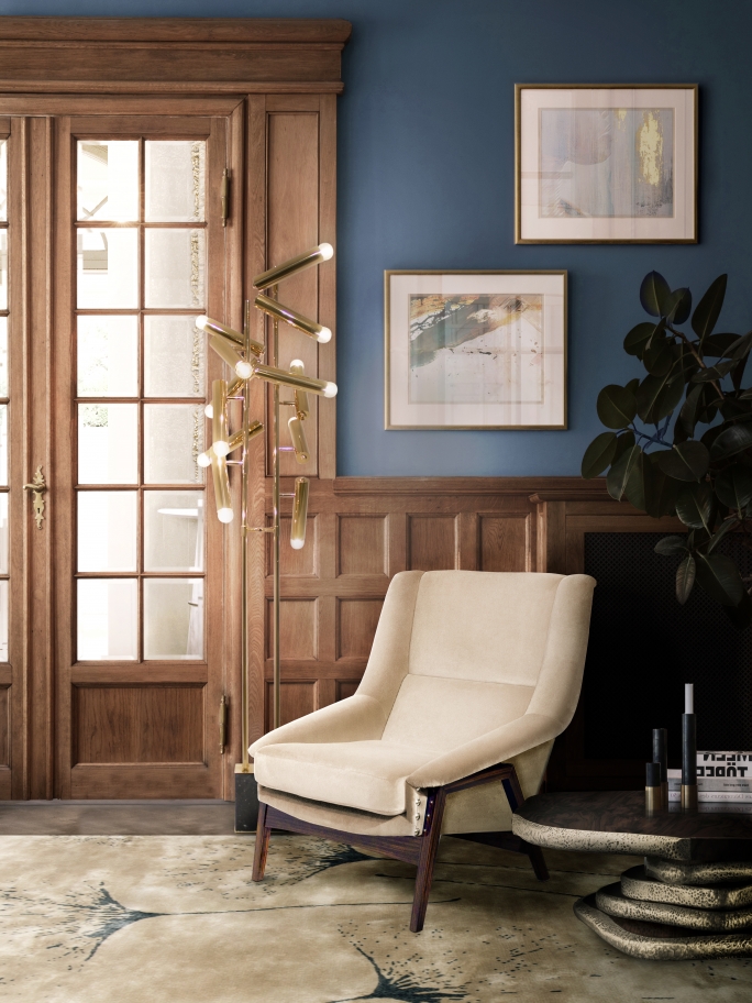 A mid-century reading corner with the blue version of Susy rug that transforms your home decoration into a colorful landscape made of bold details and charismatic features.