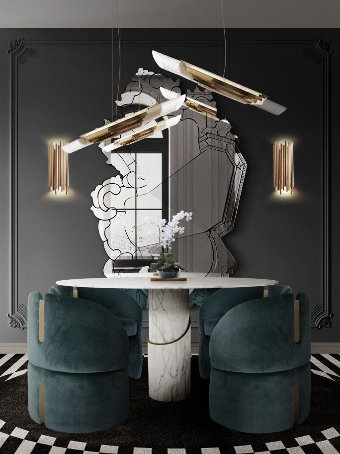 The Cell Rug is the centerpiece of this kitchen. Its neutral background and golden details brighten up the room and give it some warmth. The gold design is complemented by the rest of the details present in this environment. It sits in harmony with the room and makes a statement by adding remarkableness.
