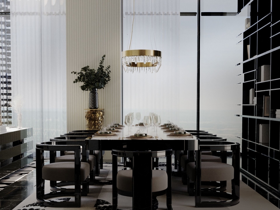 This modern dining room counts with our Dêco Rug in grey shadows contrasting with the green of the Soleil Chairs by Boca do Lobo. The Dêco rug is a handmade rug full of glamour and sophistication, with an unusual shape and the addition of fringes, which you surely won’t be able to resist.
