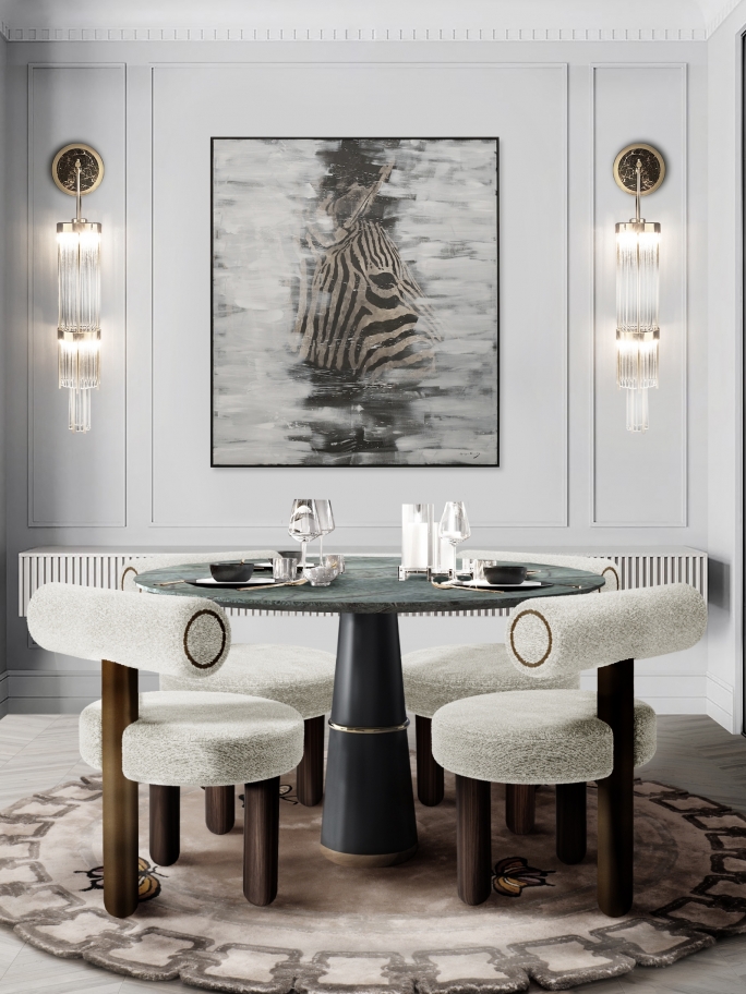 This dining room epitomizes modern elegance with a focus on sophisticated style, neutral colors, and meticulous details. The Madeira Rug, inspired by the Portuguese archipelago, integrates neutral backgrounds with shades of blue and bronze, evoking the serene beauty of beaches and the sea, crafted from natural wool and botanical silk. This hand-tufted masterpiece seamlessly brings the strength and elegance of nature into luxurious dining spaces.