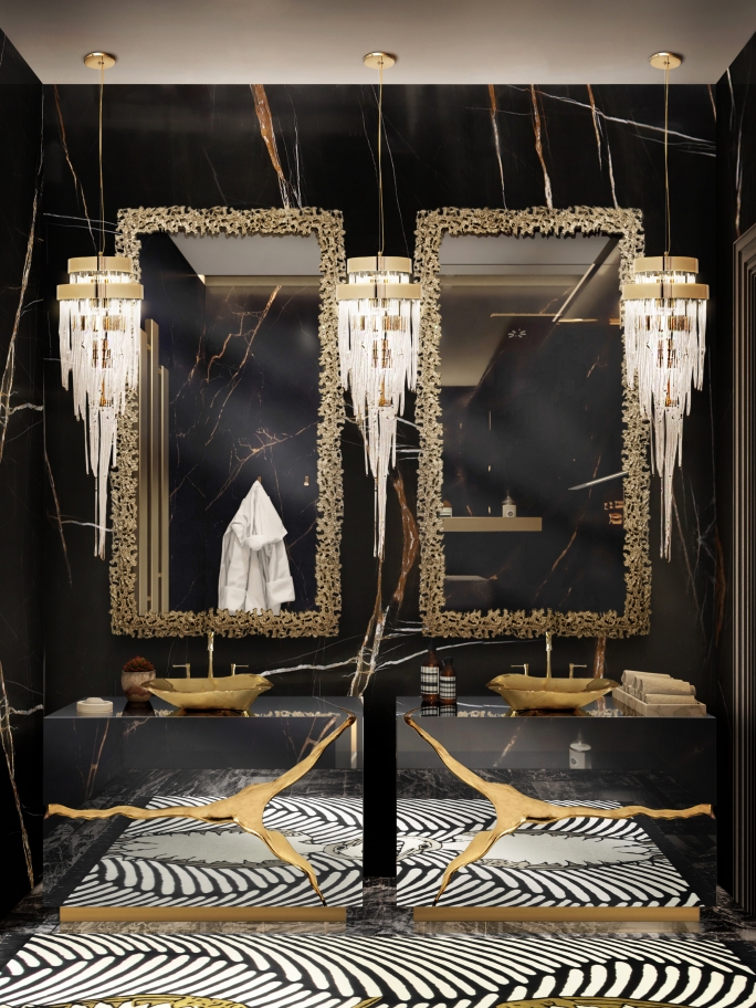 A high-end bathroom design with the Black Ink rug. Inspired by the urban life and art, the Black Ink rug is hand-tufted in botanical silk and suits this luxurious bathroom design perfectly, giving it a mysterious and discreet look.