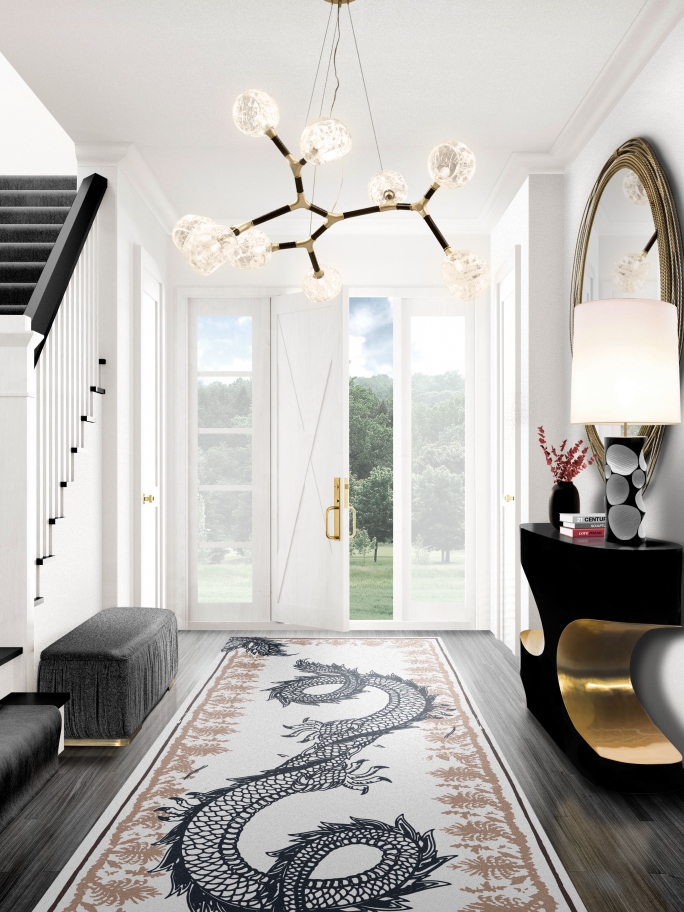 Classic entryway with neutral tones where the green Dalyans 2 Seat Sofas by BRABBU come to bring some light into the ambiance. To complete the look, our Kleopatra rug in a smaller and round shape that adapts to the trend of round shapes present in the room.