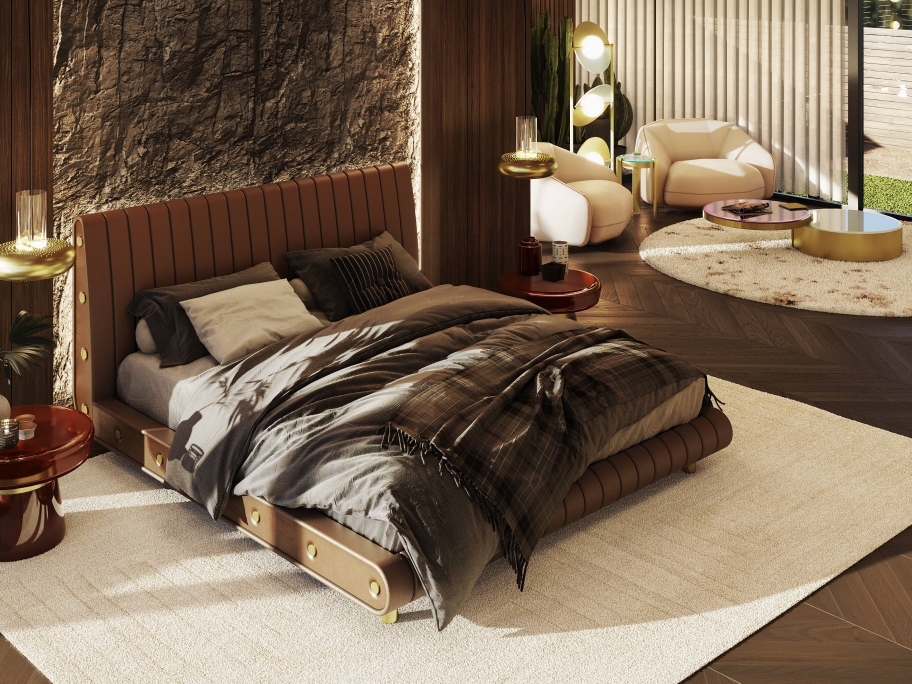 A modern bedroom with a combination of different colors and the Cauca rug bringing a geometric reference. If you are looking for a modern bedroom interior design, the Cauca geometric rug inspired by the extinct Colombian culture is perfect for an elegant and stylish bedroom.