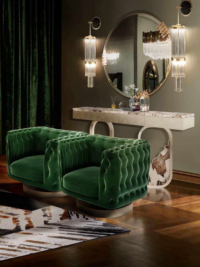 In this living room, warm colors blend with gold accents while soft, curved lines create a modern and elegant look. The Terracotta Rug serves as the centerpiece, drawing inspiration from the Italian words for 'baked earth', and bringing the raw beauty of terracotta ceramics into its design. Made in Portugal, this rug is crafted using a combination of hand-tufting, over-tufting, and carving techniques, resulting in a unique texture that adds warmth and an inviting glow to the space.